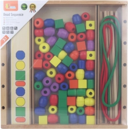 U pakiranju se nalazi sve za duge sate kreativne igre – bogat izbor obojenih perli, drveni štapići, vezice i set predložaka. Dijelovi su od glatko lakiranog drva i obojeni netoksičnim bojama na bazi vode. Praktična drvena kutija s poklopcem olakšava odlaganje i prenošenje kod kuće i u vrtiću.