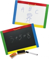 Ova univerzalna ploča spaja dvije kreativne površine u jednoj – crnu magnetsku stranu za krede i bijelu brisivu stranu za marker. Djeca mogu pisati, crtati i vježbati slova i brojke; na crnoj strani mogu jednostavno pričvrstiti magnete. U pakiranju je sve za trenutnu upotrebu: 4 krede, brisivi marker i spužvica.