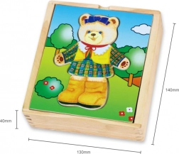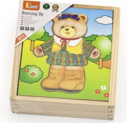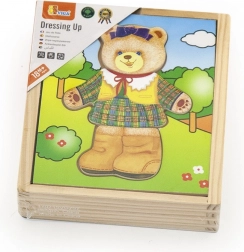 Slatki drveni set puzzli brenda Viga omogućuje djeci slaganje šest različitih slika medvjedića–djevojčice u raznim raspoloženjima i odjevnim kombinacijama. Potiče finu motoriku, logičko razmišljanje i prepoznavanje emocija, a praktična kutijica drži sve dijelove uredno na okupu.