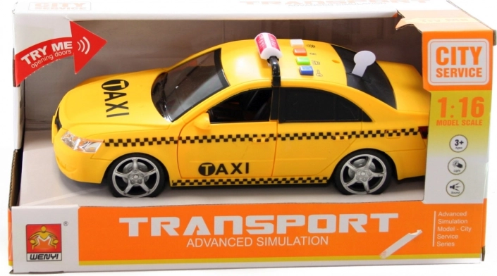 Plastični taksi na baterije sa svjetlima, zvukovima i otvarajućim vratima. Baterije 3× AG13 u pakiranju. Dimenzije vozila cca 23 × 7 cm. Prikladno za djecu od 3 godine.