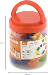 Ovaj set ekstra velikih drvenih perli idealna je igračka za rani razvoj djece. Zahvaljujući izraženim bojama i raznim oblicima djeca vježbaju sortiranje, brojanje i kreativnost, dok jačaju hvat i koncentraciju. Veličina perli prilagođena je dječjim ručicama, pa je nizanje lako i zabavno.