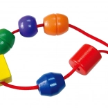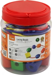 Velike drvene perle u praktičnoj kutiji s raznobojnim vezicama razveselit će svako dijete od 3 godine. Zahvaljujući ekstra veličini lako se hvataju i sigurno nižu, što potiče finu motoriku, koordinaciju oko–ruka i prepoznavanje boja i oblika. U pakiranju je 30 perli i 4 vezice za beskrajno stvaranje.