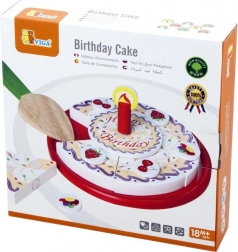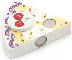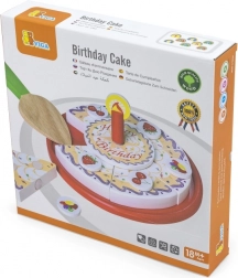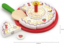 Drvena rođendanska torta na pladnju za serviranje podijeljena je na pojedinačne porcije s ukrasima i svjećicom. Zahvaljujući čičak trakama/magnetima (ovisno o izvedbi) dijelovi se lako odvajaju i ponovno spajaju. Djeca uvježbavaju hvatanje, preciznost i rječnik tijekom zajedničkog „pušenja svjećice“ i posluživanja.