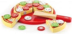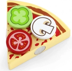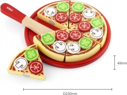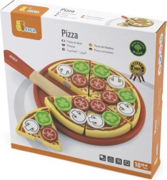 Sadržaj uključuje pizzu promjera cca 23 cm, poslužavni pladanj i lopaticu/nožić za realistično rezanje. Zahvaljujući odvojivim dodacima djeca vježbaju hvat i maštu, dok će roditelji cijeniti jednostavno održavanje i dug vijek drva.