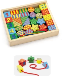Otkrijte kreativnu igru s VIGA drvenim setom za nizanje – kutijom punom šarenih oblika za nizanje na uzice poput perlica. Potiče finu motoriku, koordinaciju ruka–oko i učenje boja i oblika. Dijelovi od kvalitetnog drva s netoksičnim bojama i velikim dimenzijama za sigurno držanje.