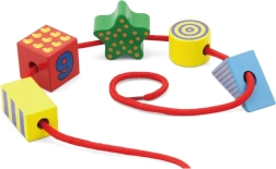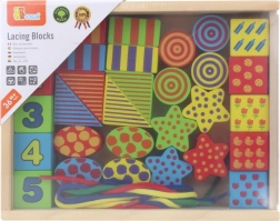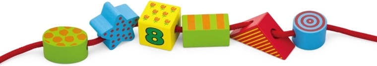 Ovaj drveni set za nizanje nudi djeci beskrajne mogućnosti stvaranja: nizanje poput perlica, slaganje tornjeva i kućica te razvrstavanje prema bojama i oblicima. Veliki dijelovi (oko 4 cm) lako se drže i idealni su za prva motorička vježbanja.