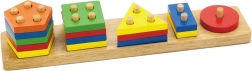 Ova čvrsta drvena slagalica s umetanjima kombinira razvrstavanje i nizanjenje oblika na klinove. Djeca uče razlikovati boje i geometrijske oblike, vježbaju koordinaciju ruka–oko i poboljšavaju spretnost pri rukovanju dijelovima. Drvo je glatko brušeno, a boje su žive i privlačne.