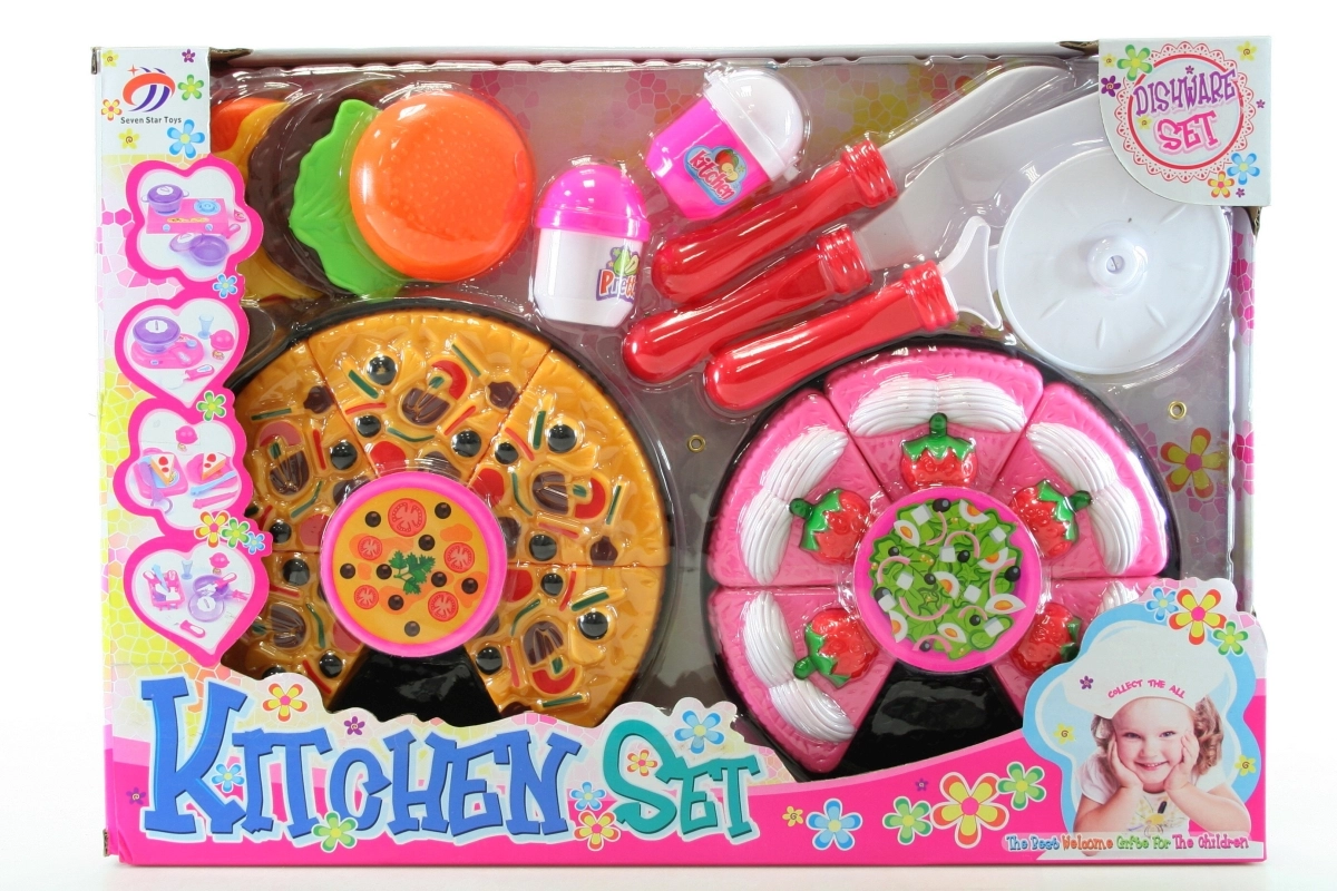 Zabavan plastični set za male kuhare sadrži kolač i tortu rezane na kriške, hamburger, soljenku, paprenku i kuhinjski pribor. Idealan za igru kuhanja i razvoj motorike. Sigurna plastična izrada, realistični dodaci i jednostavno rezanje na kriške oduševit će djecu od 3 godine.