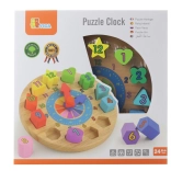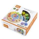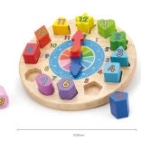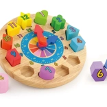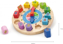 Zabavni i edukativni drveni sat za najmlađe pomaže učiti prepoznavati vrijeme, boje i oblike. Sadrži 12 šarenih umetaka s brojevima koji razvijaju finu motoriku, logiku i koordinaciju oko–ruka. Idealna igračka za djecu od 24 mjeseca.