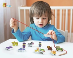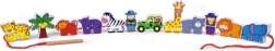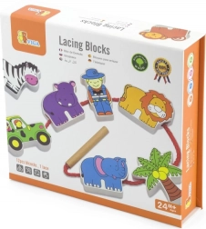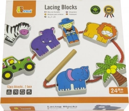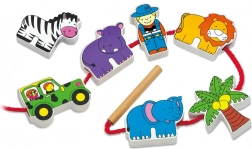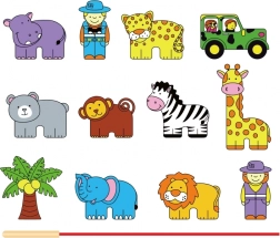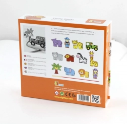 Set sadrži drvene kocke koje prikazuju stanovnike safarija, uključujući leoparda, palmu, majmuna, nilskog konja, zebru, džip, žirafu, medvjeda, lava, slona i vodiča. Kocke su precizno oslikane s obje strane netoksičnim bojama i donose djeci mnogo radosti pri igri. Svi su elementi osmišljeni tako da potiču razvoj fine motorike i znanje o svijetu životinja.