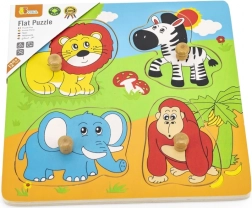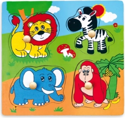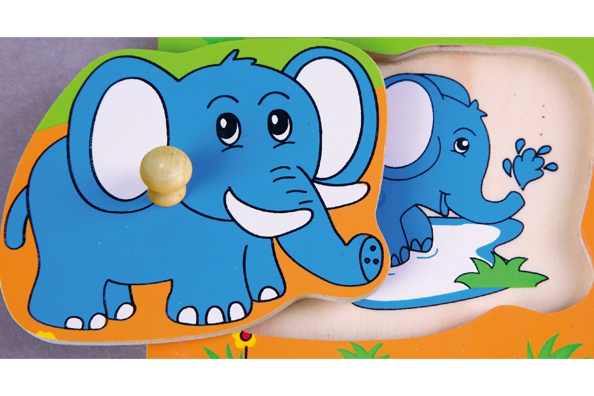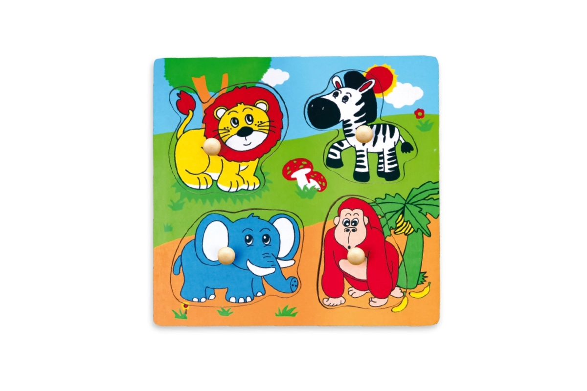 Ova kvalitetna drvena umetaljka sa safari motivom idealna je prva slagalica za mališane. Svaki dio ima drveni klin za lako držanje malim ručicama te odgovarajuću siluetu na podlozi za lakšu orijentaciju.