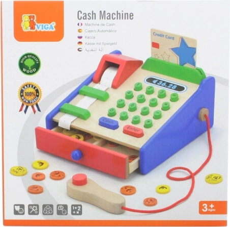 Blagajna je izrađena pretežno od drva i nadopunjena izdržljivim plastičnim elementima. Idealna za igru trgovine kod kuće i u vrtiću, gdje prirodno razvija logičko razmišljanje, kognitivne vještine i odnos prema brojevima u duhu Montessorija.