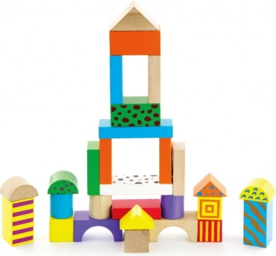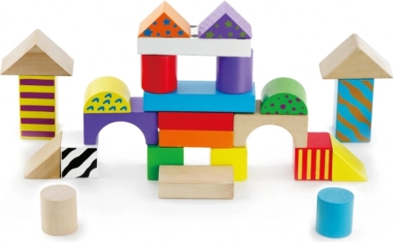 Raznoliki oblici – kocke, valjci, lukovi i krovovi – potiču maštu te podržavaju finu motoriku i prostornu percepciju.