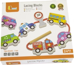 12 komada i uzica s drvenim štapićem omogućuju nizanje, slaganje i stvaranje priča o gradskom prometu.