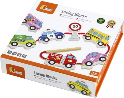 Ovaj kvalitetan drveni set za nizanje vozila donosi djeci radost učenja kroz igru. Sadrži 12 obostrano oslikanih elemenata s automobilima, autobusom, kolima hitne pomoći, vatrogasnim vozilom i prometnim znakovima te čvrstu uzicu sa štapićem za lako provlačenje. Djeca mogu stvarati vlastite priče o gradskom prometu, putovanjima i sigurnosti na cesti.