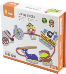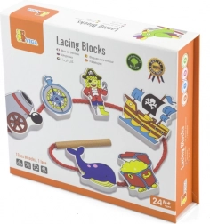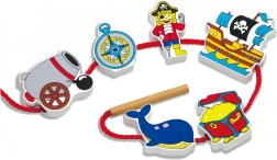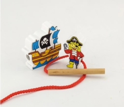 Zabavan set za najmlađe s piratskom tematikom razvija finu motoriku, koordinaciju oko–ruka i kreativnost. Sadrži 12 drvenih blokova i dugu uzicu za nizanje, pakirano u praktičnu kutijicu – služi kao spremnik. Prikladno od 24 mjeseca.