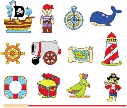 - Piratski motivi: brod, pirat, kormilo, blago i drugi šareni elementi potiču tematsku igru.