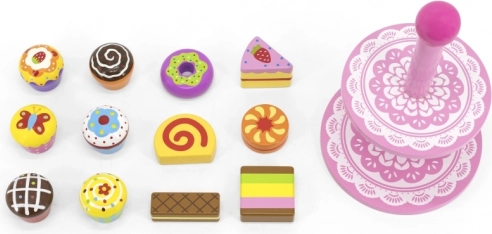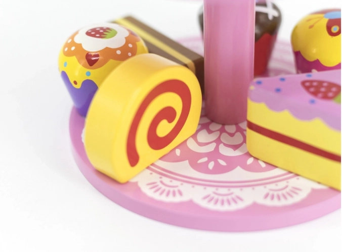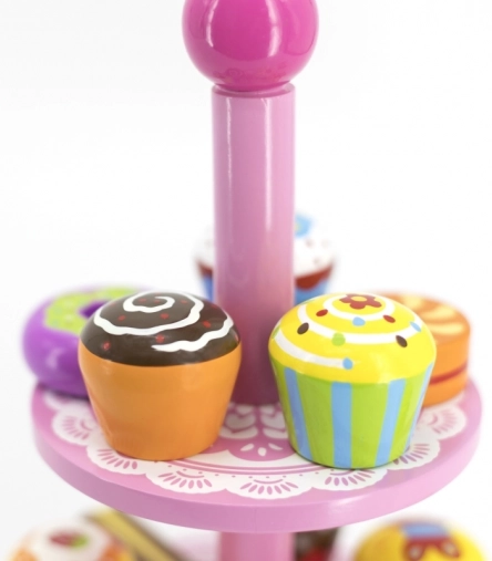 Ovaj stilski set drvenih deserata na dvoslojnom stalku idealan je za igru kavane, čajanke ili dječje slastičarnice. Kvalitetno izrađeni drveni komadi u živim bojama pozivaju na istraživanje i vježbaju koordinaciju ruke i oka.
