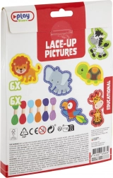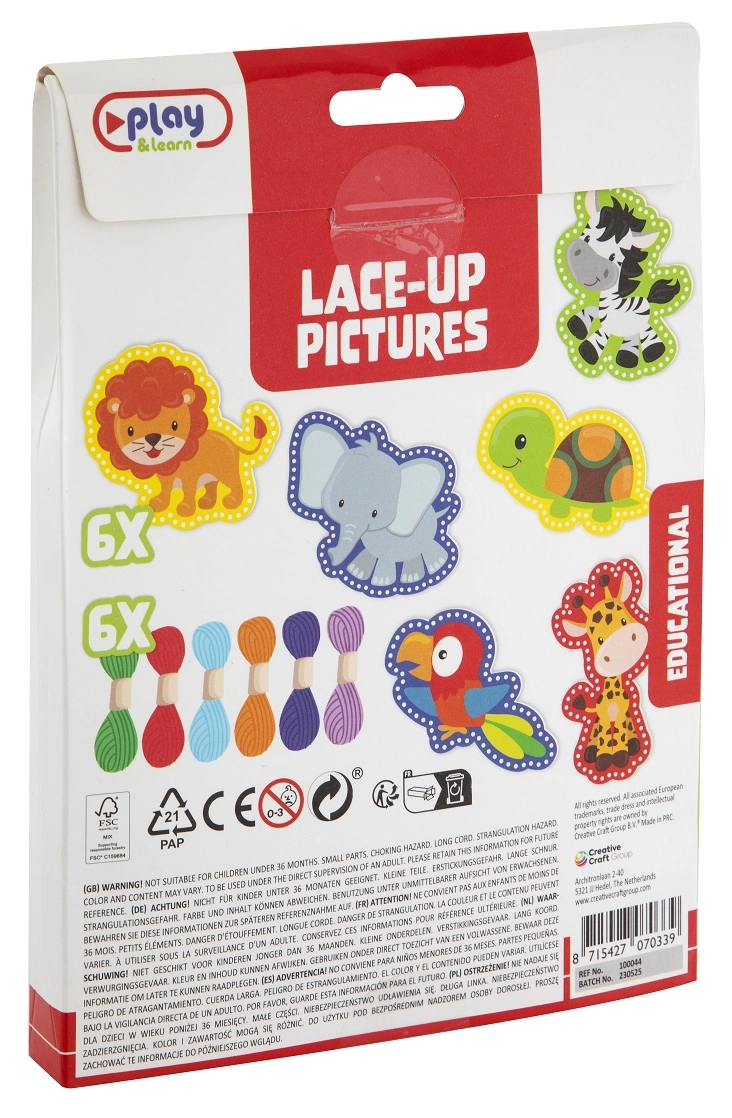 Svaka od 6 čvrstih sličica ima unaprijed pripremljene rupice za lako provlačenje, stoga je aktivnost prikladna i za početnike. U pakiranju se nalazi 6 vezica u različitim bojama – dovoljno je odabrati sličicu, provlačiti i gledati kako motiv oživljava.