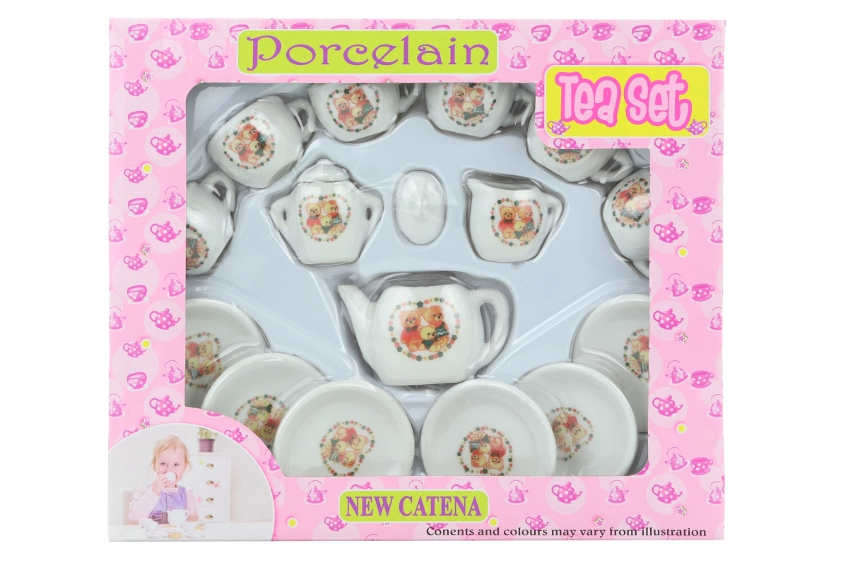 Slatki porculanski čajni set s motivom medvjedića razveselit će sve male domaćice i domaćine. Sadrži čajnik, šalice s tanjurićima i dodatne pribore za savršeni čajni party. Kompaktno pakiranje dimenzija 24,5 × 20,5 × 4,5 cm idealno je za putovanja i spremanje nakon igre. Pogodno za djecu od 3 godine.