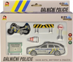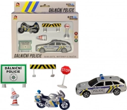 Ovaj set donosi autentičan doživljaj rada autocestne policije, kakvu poznajete s naših cesta. Metalni policijski automobil sa svjetlosnim i zvučnim efektima i plastični motocikl zajedno s prometnim znakovima potiču kreativnu igru i razvoj mašte. Zahvaljujući povratnom navijanju vozila se brzo pokreću i zabava može početi.