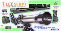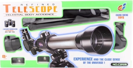 Plastični teleskop sa stalkom. Promjer objektiva 60 mm, fokusna udaljenost 170 mm, povećanje 20x, 30x i 40x. Dimenzije pakiranja cca 43 x 22 x 8 cm. Dob 8+