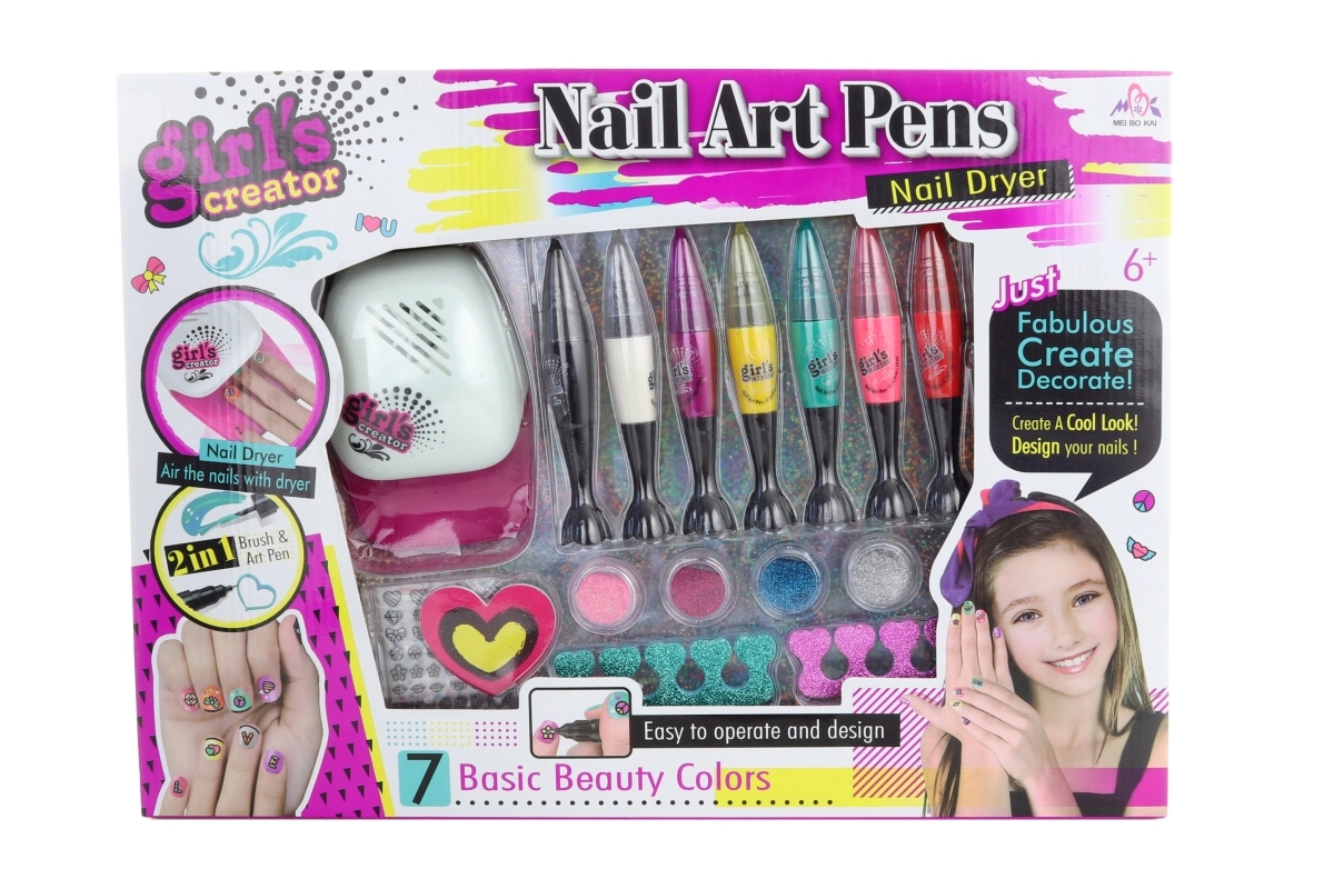 Stvorite kod kuće nail art remek-djelo s kompletnim kreativnim setom za male stilistice. Set sadrži 7 lakova u boji s dvostranim aplikatorom (kistić i olovka), suhu za nokte na 2× AAA baterije, rašpicu, razdjelnike za prste, svjetlucave prahove i šarene naljepnice. Idealno za djecu od 6 godina.