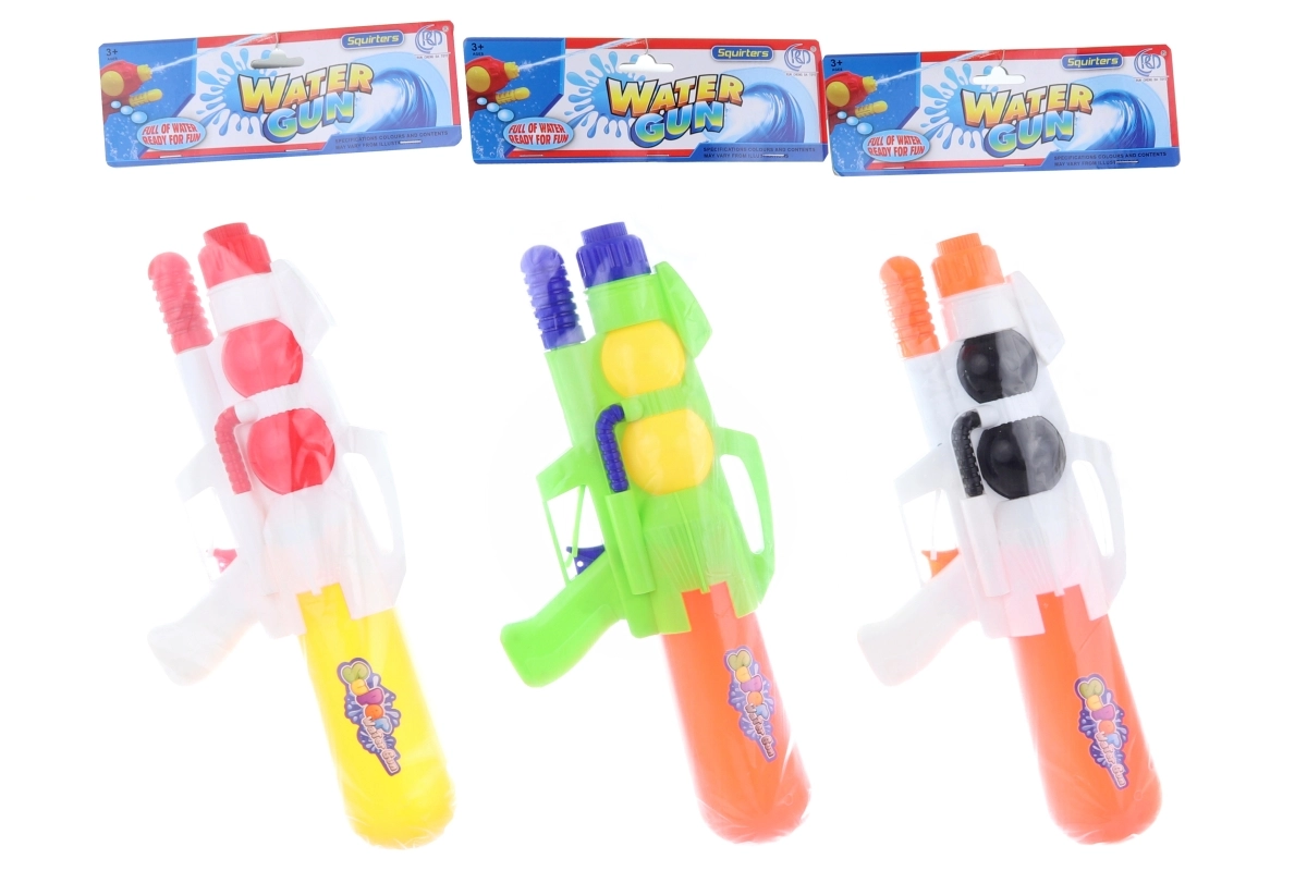Plastični vodeni pištolj dimenzija približno 35 x 17 x 6,5 cm. Veličina pakiranja približno 20 x 48 x 6,5 cm. Dob 3+