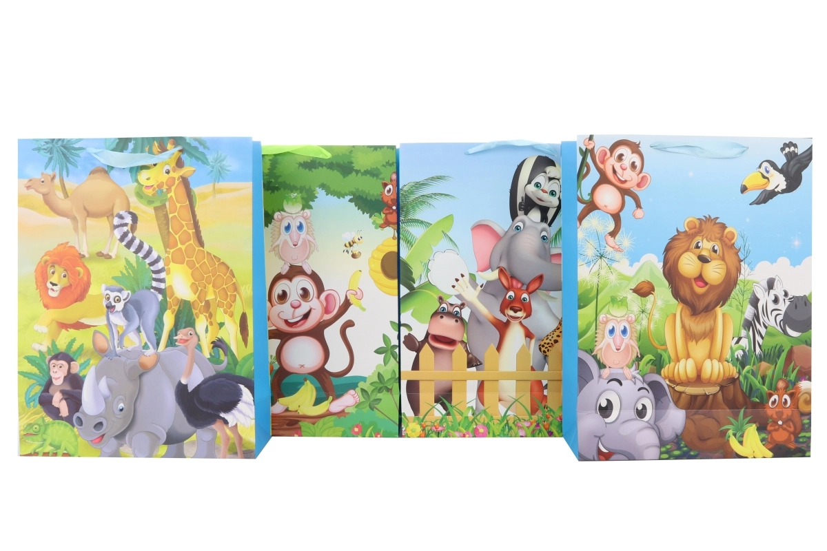 Velika poklon-vrećica sa safari motivima idealna je za pakiranje glomaznijih poklona. Atraktivni dizajni s egzotičnim životinjama daju poklonu poseban izgled i štede vrijeme pri pakiranju. Vrećica je prikladna za djecu i odrasle te je primjerena za rođendane, proslave i blagdane.