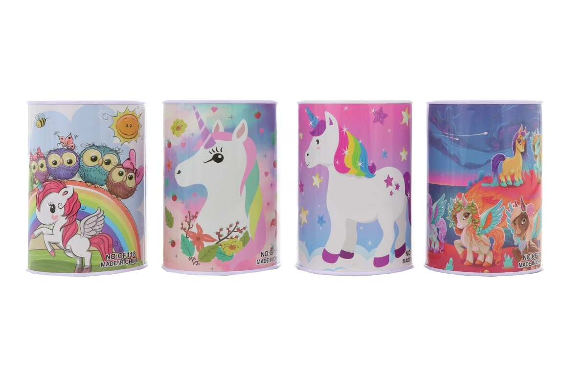 Slatka metalna kasica s motivom jednoroga razveselit će svako dijete. Izdržljiva limena konstrukcija i kompaktne dimenzije idealne su za prve uštede. Bez otvaranja za veću sigurnost, prikladno za djecu od 3 godine.