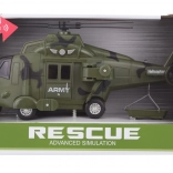 Vojni helikopter na baterije sa svjetlom i zvukom. Helikopter ima vitlo s kukom, rotirajući rotor i rotirajuće prednje svjetlo. Napajanje 3x AG13 (uključene u pakiranje). Dimenzije helikoptera cca 28 x 14 cm. Dimenzije pakiranja cca 32 x 12 x 19 cm. Dob 3+