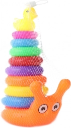 Zabavna slagalica za slaganje za najmlađe: plastični stup u obliku puža s raznobojnim prstenovima i veselom patkicom na vrhu. Potiče finu motoriku, koordinaciju oko–ruka i učenje boja i veličina. Idealno za djecu od 12 mjeseci.