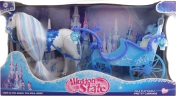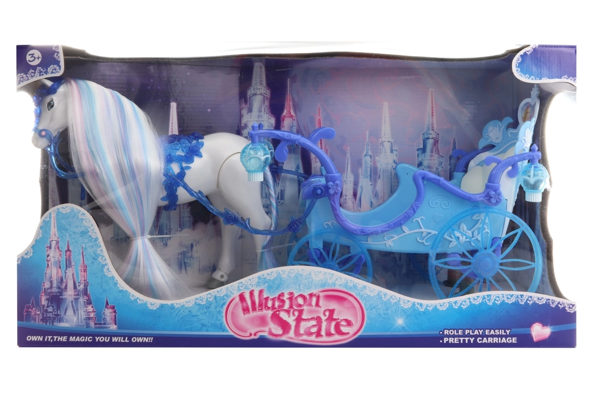 Konjić s plavom kočijom. Nakon umetanja baterija konjić hoda, svira, a na kočiji svijetle lampice. Napajanje s 2 AA baterije (nisu uključene u pakiranje). Dimenzije pakiranja cca 56 × 30 × 19 cm. Dob 3+
