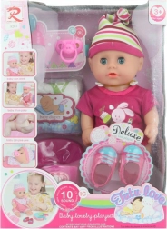 Preslatka beba veličine 30 cm koja nakon umetanja baterija ispušta realistične zvukove i može piškiti. U pakiranju se nalazi bogat set dodataka uključujući cipelice, plastičnu slinčicu, bočicu i tanjurić. U kompletu su i baterije, pa se djeca mogu igrati odmah nakon otvaranja.