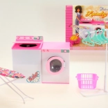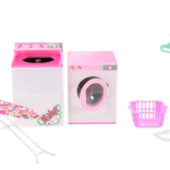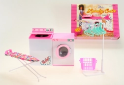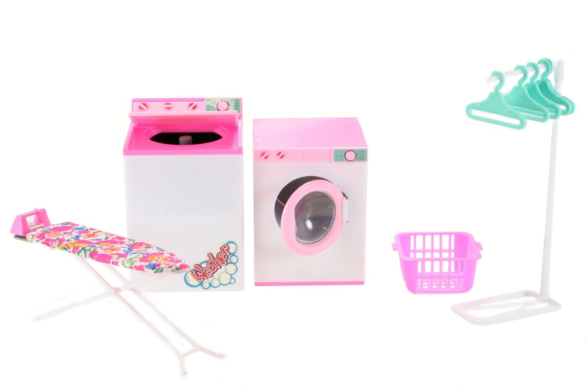 - Sadržaj seta: perilica (prednji poklopac na otvaranje), sušilica (gornji poklopac na otvaranje), daska za glačanje, glačalo za lutke, stalak za odjeću s 5 vješalica, košara za rublje