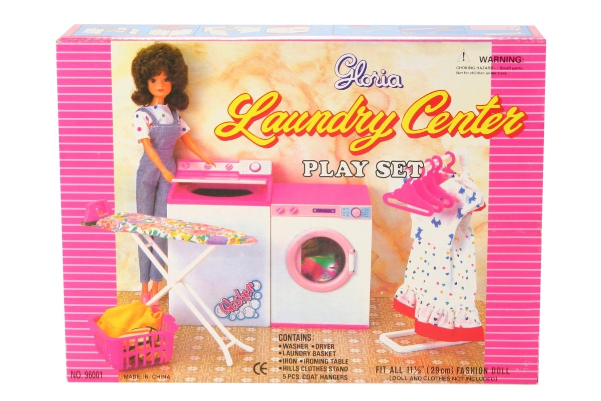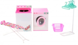 Zabavan i detaljan set za pranje rublja za lutke GLORIE donosi sve potrebno za igru kućanstva: perilicu i sušilicu s otvarajućim poklopcima, dasku za glačanje s glačalom, stalak s vješalicama i košaru za rublje. Idealno za djecu od 3 godine.