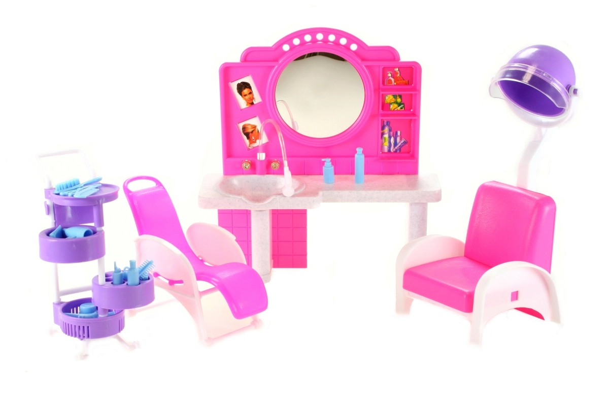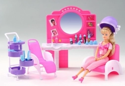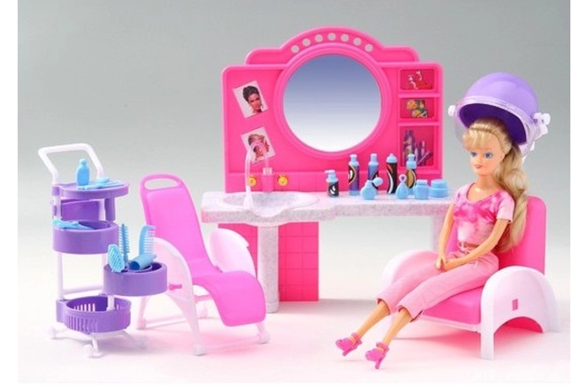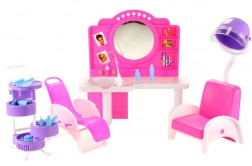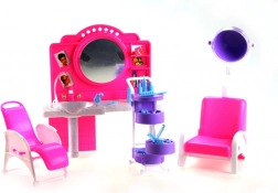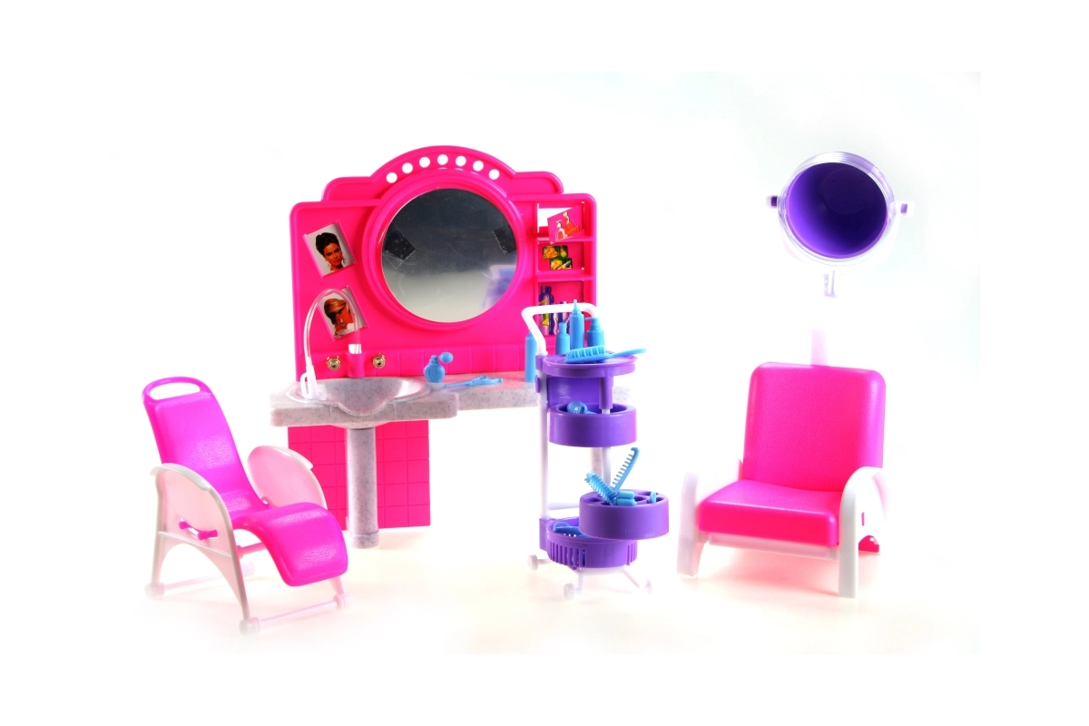 Stilski igraći set Glorie frizerski salon donosi djeci puno zabave u igri frizerskog salona. Sadrži toaletni stolić sa zrcalom i umivaonikom, udobne frizerske stolice, kolica s pretincima te niz dodataka za uređivanje kose, kao što su češljevi, četke i bočice. Izrađeno od izdržljive plastike. Lutka nije uključena u pakiranje. Prikladno za djecu od 3 godine.