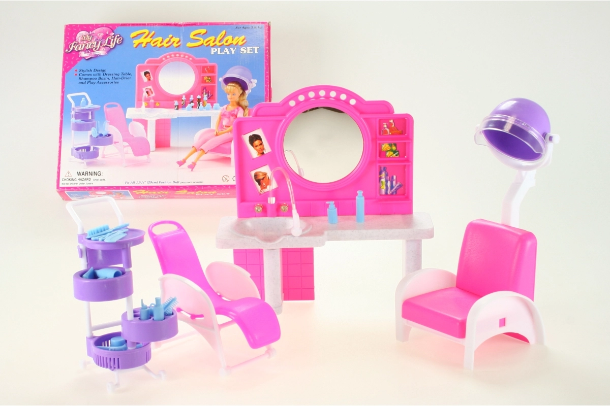 - Toaletni stolić sa zrcalom i umivaonikom, frizerska stolica, frizerska stolica sa sušilom (nefunkcionalno), kolica s pretincima, češljevi, četke, bočice