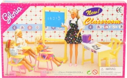 Stvorite školsku atmosferu kod kuće s setom Glorie školski razred. Ovaj bogato opremljen set uključuje ploču, učiteljski stol i stolicu, 3 stolice s naslonima za ruke, računalo s tipkovnicom, torbe i papirnate bilježnice i testove. Idealan za kreativnu igru i razvoj dječje mašte. Lutke nisu uključene u pakiranje.