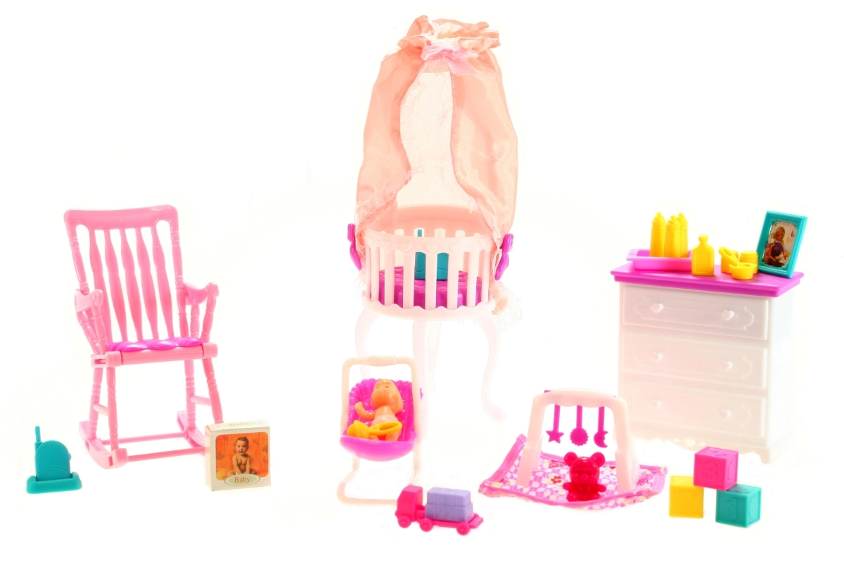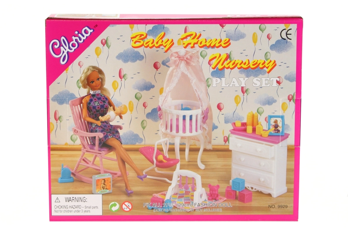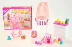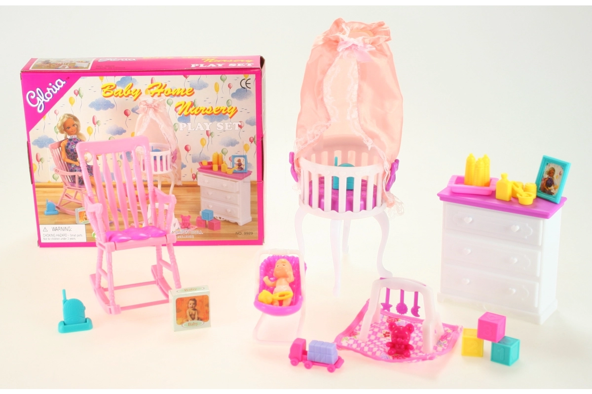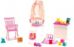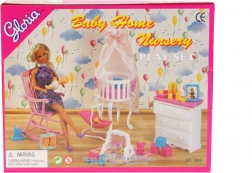 Kompletni set za bebu brenda Glorie donosi sve što je dječjoj sobici potrebno za igru s lutkama. U setu su komoda s ladicom, krevetić s baldahinom, ležaljka, klimajuća stolica, dodaci za njegu bebe i sama beba. Idealno za djecu od 3 godine za razvoj mašte i njegovateljskih vještina.