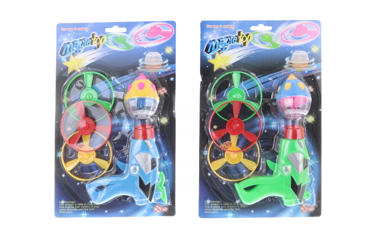 Otkrijte jednostavnu i sigurnu igračku koja će zabaviti djecu na duge sate. Ispaljivač pištolj veličine cca 11 × 10 cm lako ispaljuje vrtuljke promjera cca 7 cm ili zavrti čigru koja pri okretanju svijetli. Idealno za igru kod kuće i na otvorenom.