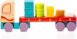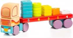 Drvena slagalica CUBIKA Kamion s geometrijskim oblicima više je od obične igračke. S 19 šarenih dijelova djeca mogu učiti povezivati oblike i boje, što razvija njihove senzomotoričke sposobnosti. Svaki je dio dizajniran da se uklapa u druge, a napredniji graditelji mogu provjeravati točan broj posloženih dijelova prema brojkama na podvozju kamiona.
