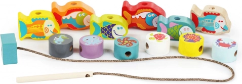 Drveni set za nizanje s ribama i morskim organizmima savršen je alat za razvoj fine motorike i kreativnosti, izrađen od ekološki uzgojenog drva.