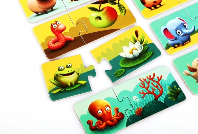 Set sadrži 20 čvrstih dijelova koji čine 10 tematskih parova. Ilustracije su izražajne i šarene kako bi zadržale pažnju i potaknule istraživanje. Kvalitetan ekološki karton sa sjajnom završnom obradom izdržljiv je i može se obrisati vlažnom krpicom.