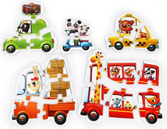 Složite pet šarenih vozila sa životinjama. Svaka slika ima 2–6 dijelova i podržava postupno učenje bez frustracije.