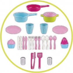 - Sadržaj pakiranja: set pribora za 4 djece, ladica za pribor, pećnica s limom, ploča za kuhanje, sudoper s pipom, 3 lonca, 2 čaše, 2 tanjurića, 2 klješta, soljenka, paprenka i 2x cupcake