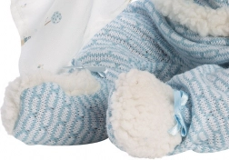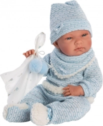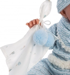 Uz modernu plavu dekicu s ušima, koja odgovara njegovoj odjeći, dio opreme također uključuje dekorativnu dudu. Lutka je upakovana u atraktivno poklon pakiranje koje oponaša kuću marke Llorens.