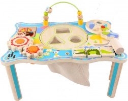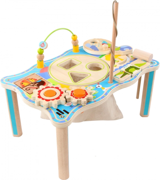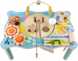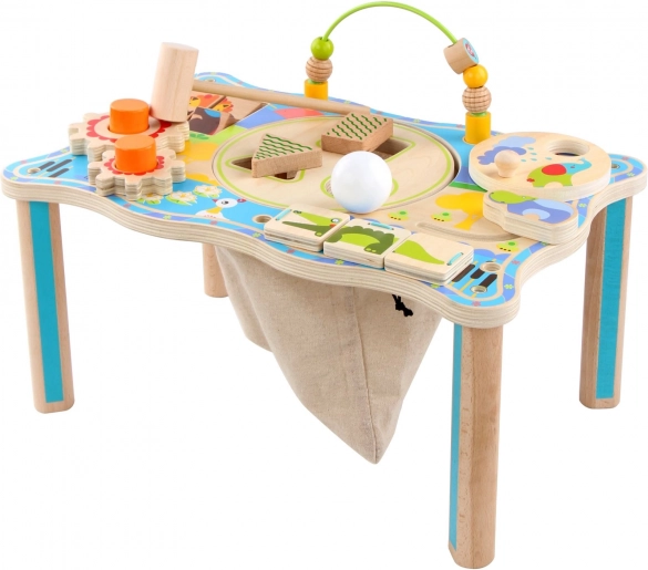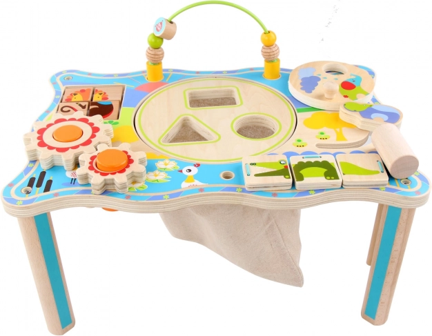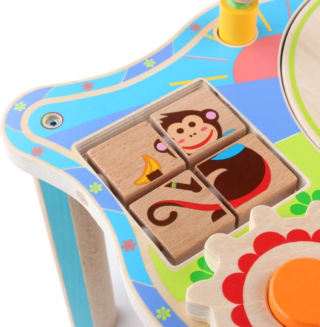 Drveni stolić s motivima džungle spaja zabavu i učenje te potiče finu motoriku, koordinaciju oko–ruka i logičko razmišljanje. Djeca mogu okretati zupčanike, pomicati perlice po stazi, vježbati snagu i koncentraciju uz igru čekićem te uvježbavati prepoznavanje oblika zahvaljujući umetaljci. U sredini je lanena vrećica za ulovljene ribice i igraće dijelove, koja održava igraću plohu urednom.