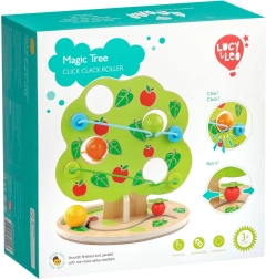 Dizajnerski atraktivan tobogan za kuglice u obliku stabla nudi nekoliko kaskadnih tračnica sa strane. Dovoljno je staviti jednu od glatkih, velikih drvenih kugli na vrh i promatrati kako se kotrlja prema dolje, proizvodi ritmično “klikanje” i zaustavlja se u podnožju stabla. Igračka je idealna za aktivnu djecu koja vole kretanje, zvukove i otkrivanje uzroka i posljedica.