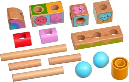 Dio pakiranja je 24 izazova/predložaka koji se postupno otežavaju. Zahvaljujući lanenoj vrećici svi se dijelovi lako pospremaju, pa je igračka idealna i za putovanja. Sigurni materijali i glatki rubovi prilagođeni su dječjim rukama.